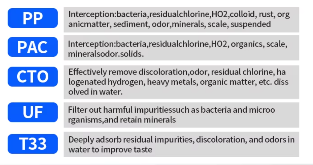 | 2 | PAC | Interception: Bacteria, residual Chlorine, HO2, Organics, Scale, Mineral Odor and Solid. Advantages: It has a stronger adsorption capacity than granular activated carbon (GAC). Due to its larger specific surface area, it is often used in the pretreatment stage to enhance the subsequent filtration effect |